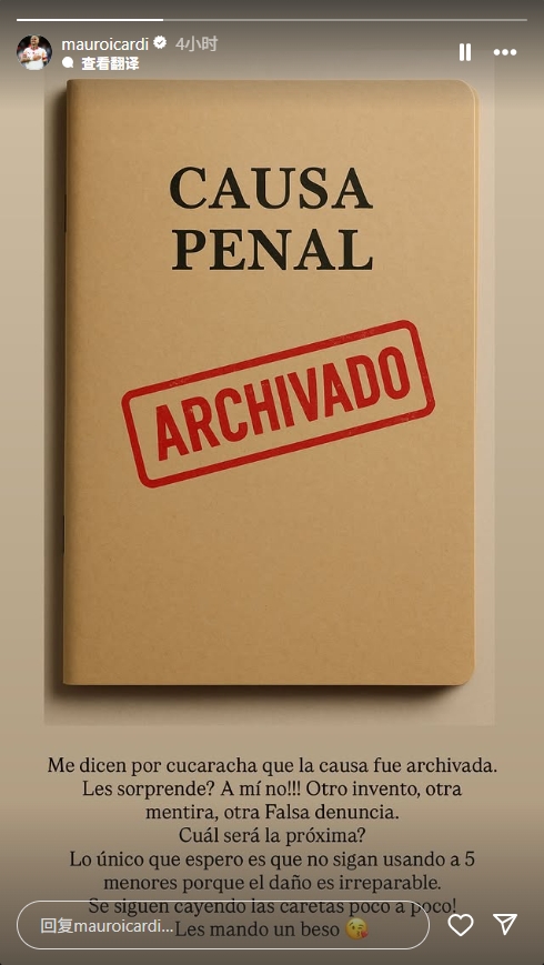 报道称,在旺达与前夫马克西-洛佩斯代表其某个儿子提出指控后,帕切科总检察院已裁决终止对伊卡尔迪涉嫌轻微伤害案的调查。