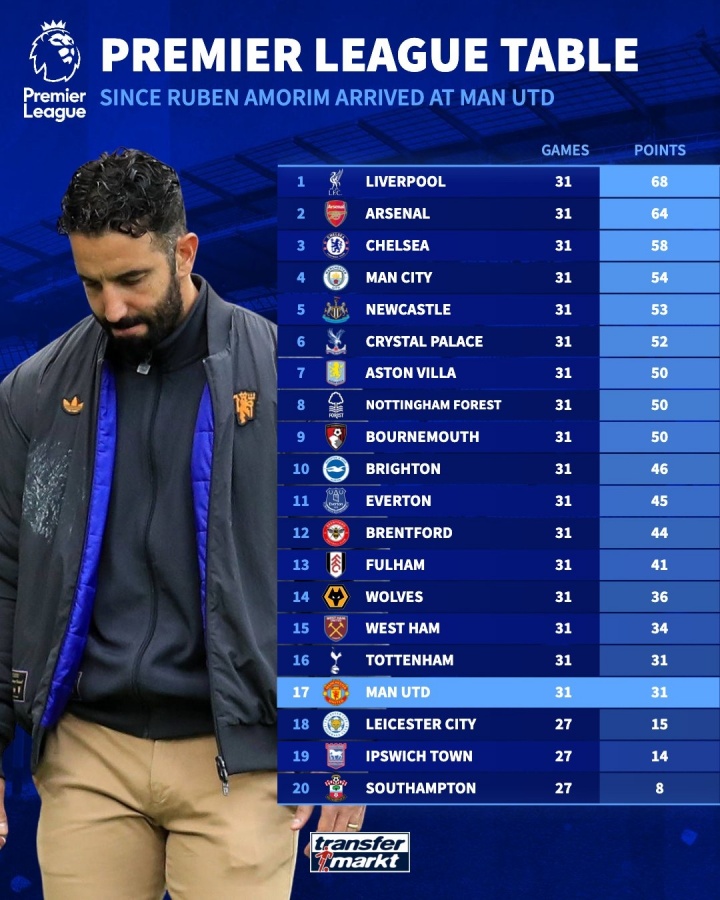 此外,阿莫林上任后带领曼联在31轮英超中仅获得31分,除去涉及升降级的球队(因场次数量不同)同期英超排名垫底,甚至不及利物浦、阿森纳积分的一半。